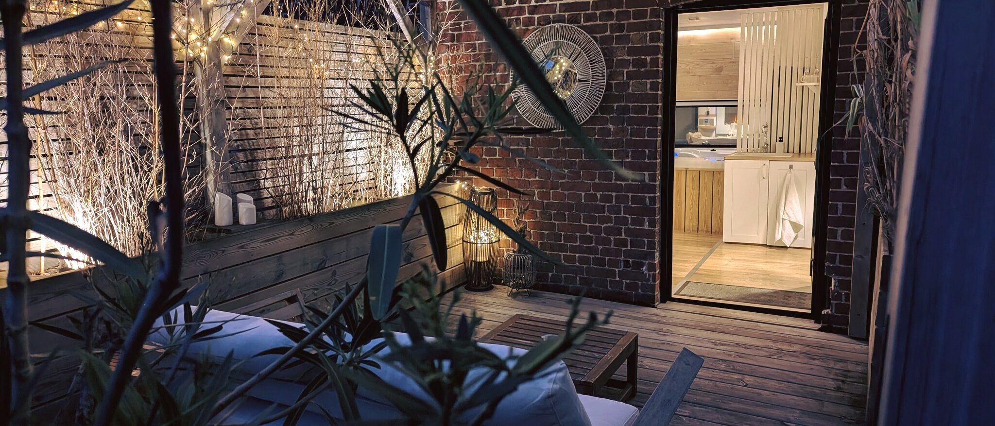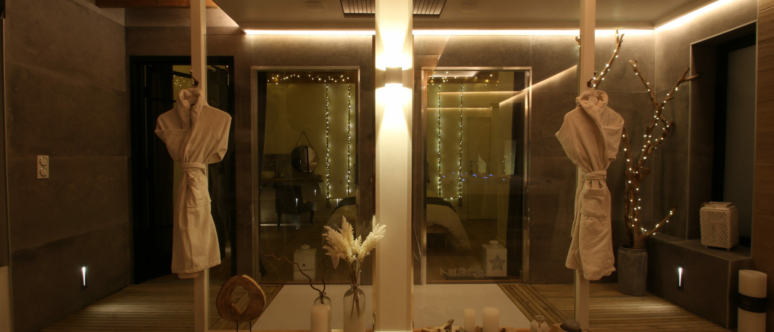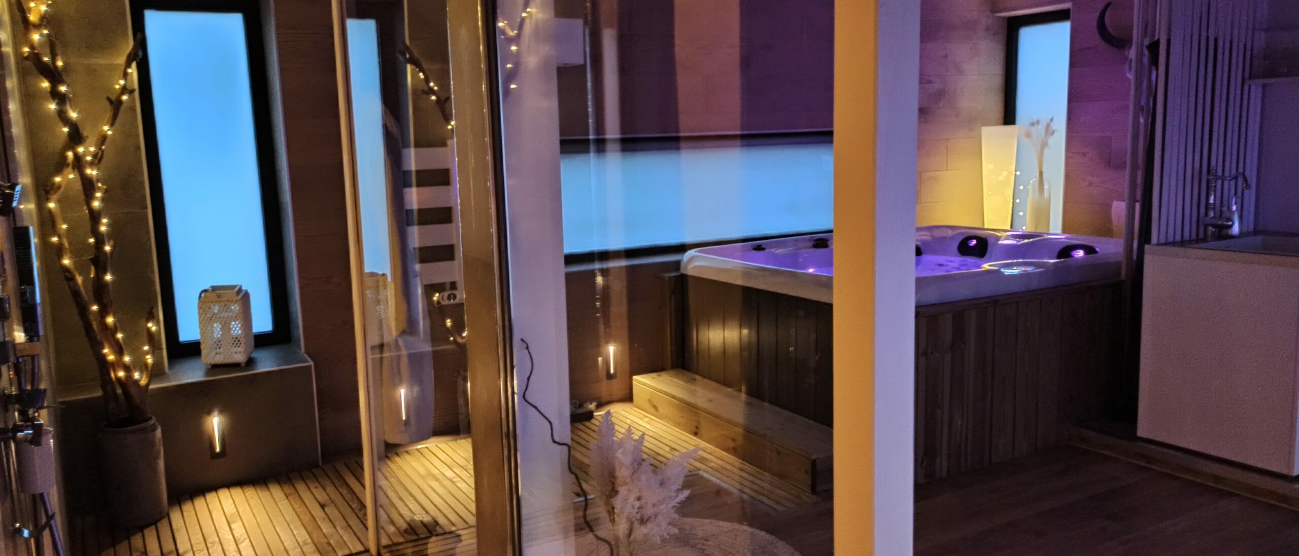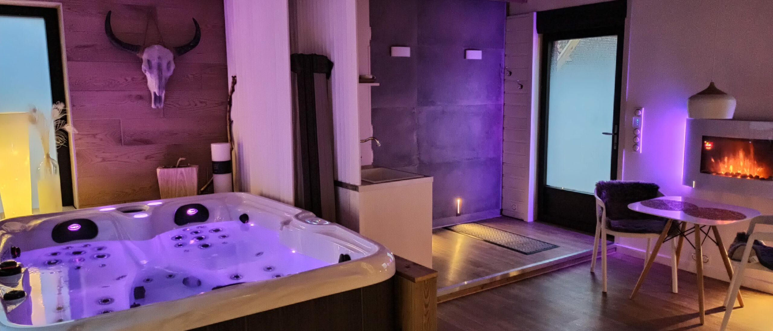 La chambre des Lucioles La chambre des Lucioles Les disponibilités Jacuzzi 2 places allongées dont 1 spéciale pour femme Douche à jets Un immense pommeau de pluie Chambre séparée La chambre est séparée de votre coin spa